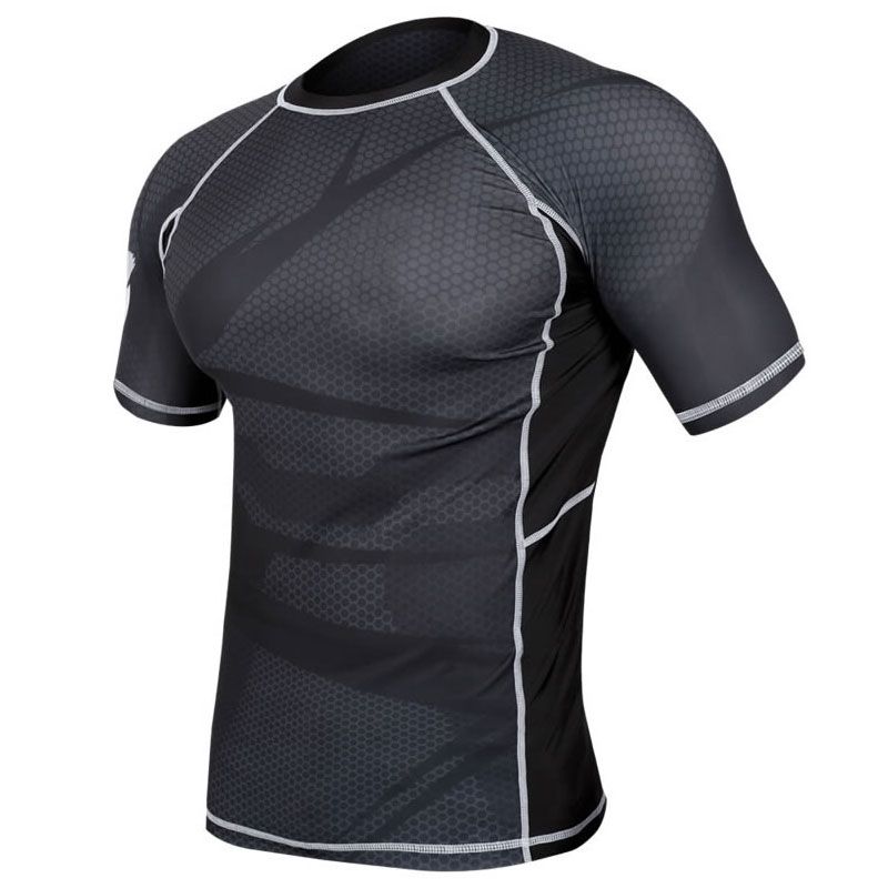 88% polyester and 12% spandex construction 100% Authentic Fight wear rash guard Fiber-fused graphics wont peel or fade providing long lasting durability Rash Guard Provides protection against scrapes, rashes and cuts Sweat Wicking Technology wicks away moisture keeping your body cool and dry Four Way Stretch fabric stretches in all directions allowing for maximum range of motion Compression fiber technology: improve blood flow to your working muscles and accelerate your recovery time Upper-Welded: specific thermal-welding seamless assembly in order to deliver a soft and smooth sensation on your skin Short Sleeves style Rash Guard, Light Weight and Breathable Fabric keeps you cool and comfortable Reinforced Stitching provides long lasting durability Customize sizes and wide range of colors, Custom logo are welcomed